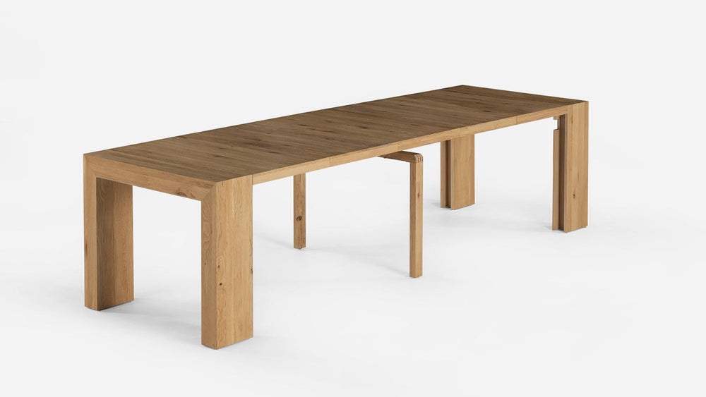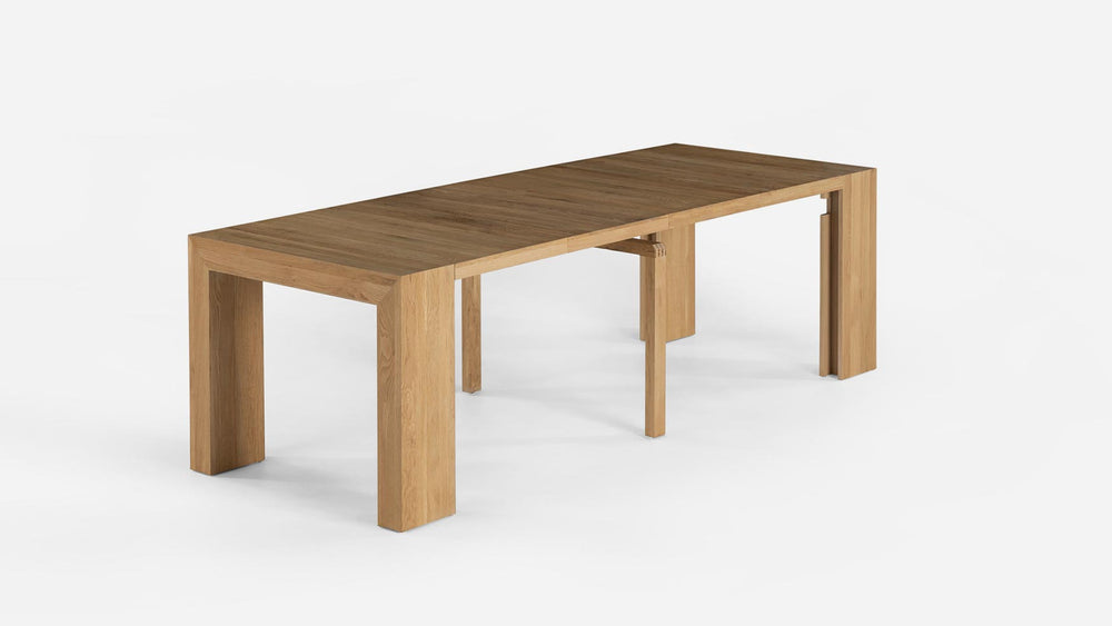 This solid wood extendable dining table is unlike any other you have ever seen. Regain ultimate flexibility in your dining space with the versatile Transformer Table™, which allows you to expand its size from as small as an entrance console all the way to a long banquet table for 12.