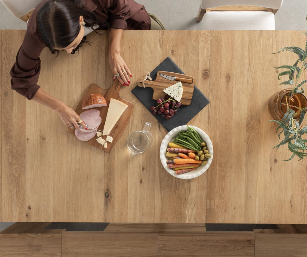 This furniture line is scratch, heat, stain, and liquid resistant. Due to the nature of the solid wood materials, we highly recommend taking the necessary precautions to keep your dining table looking brand new for many years to come, such as using protective accessories like tablecloths, placemats, coasters, and hot plates to shield your Transformer Table™. Make sure to store your different Transformer Table™ components in the same living space as much as possible, and always keep them in a climate-controlled area. Optionally, you can occasionally use solid wood polishing oil to restore the shine of your hardwood furniture pieces. In the case of an accidental scuff, we do include a bottle of touch-up stain with each Transformer Table™ order so you have a perfect match on hand. -